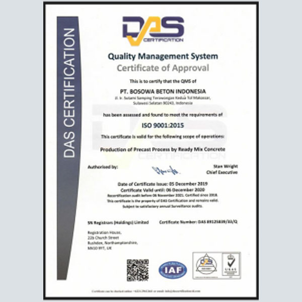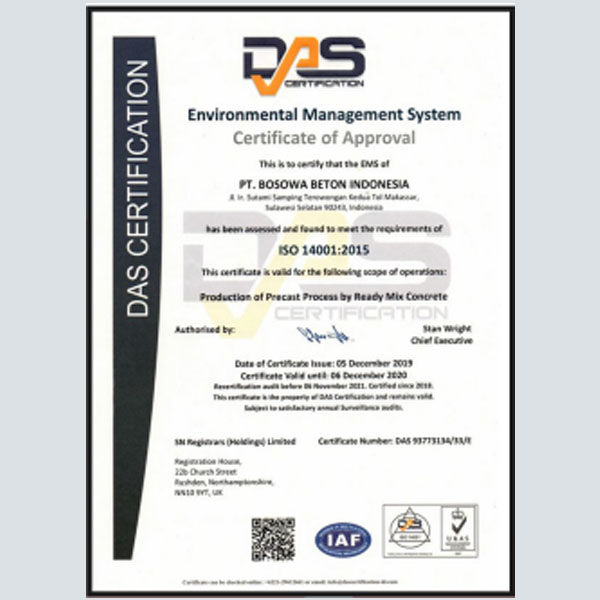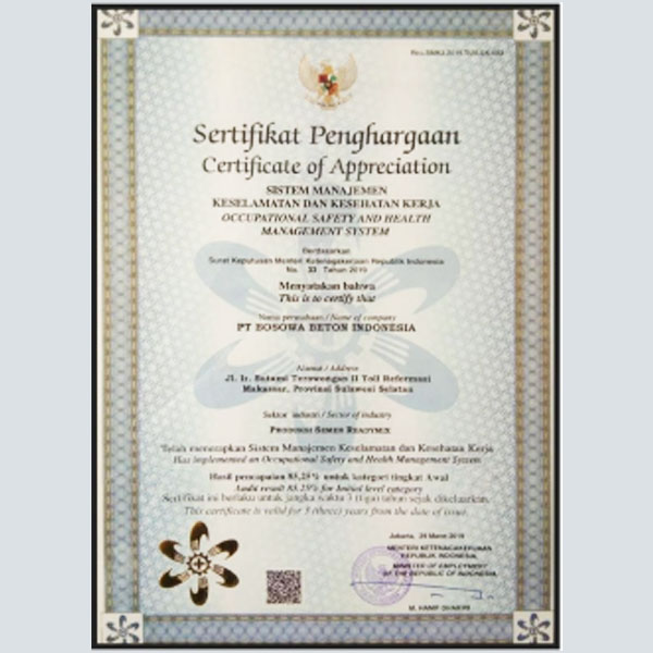 Sebagai komitmen perusahaan dalam hal terwujudnya budaya K3 dan perusahaan yang ramah lingkungan dan menerapkan budaya K3, PT. Bosowa Beton Indonesia dalam kegiatan operasional memprioritaskan aspek mutu lingkungan K 3, dimana dalam penerapan sistem manajemen terintegrasi menggunakan ISO 9001:2015 (Sistem Maanagemen Mutu), ISO 14001:2015 (Sistem Managemen Lingkungan), dan peraturan pemerinta RI No. 50 Tahun 2012 (Sistem Managemen Keselamatan Kerja) secara konsisten..